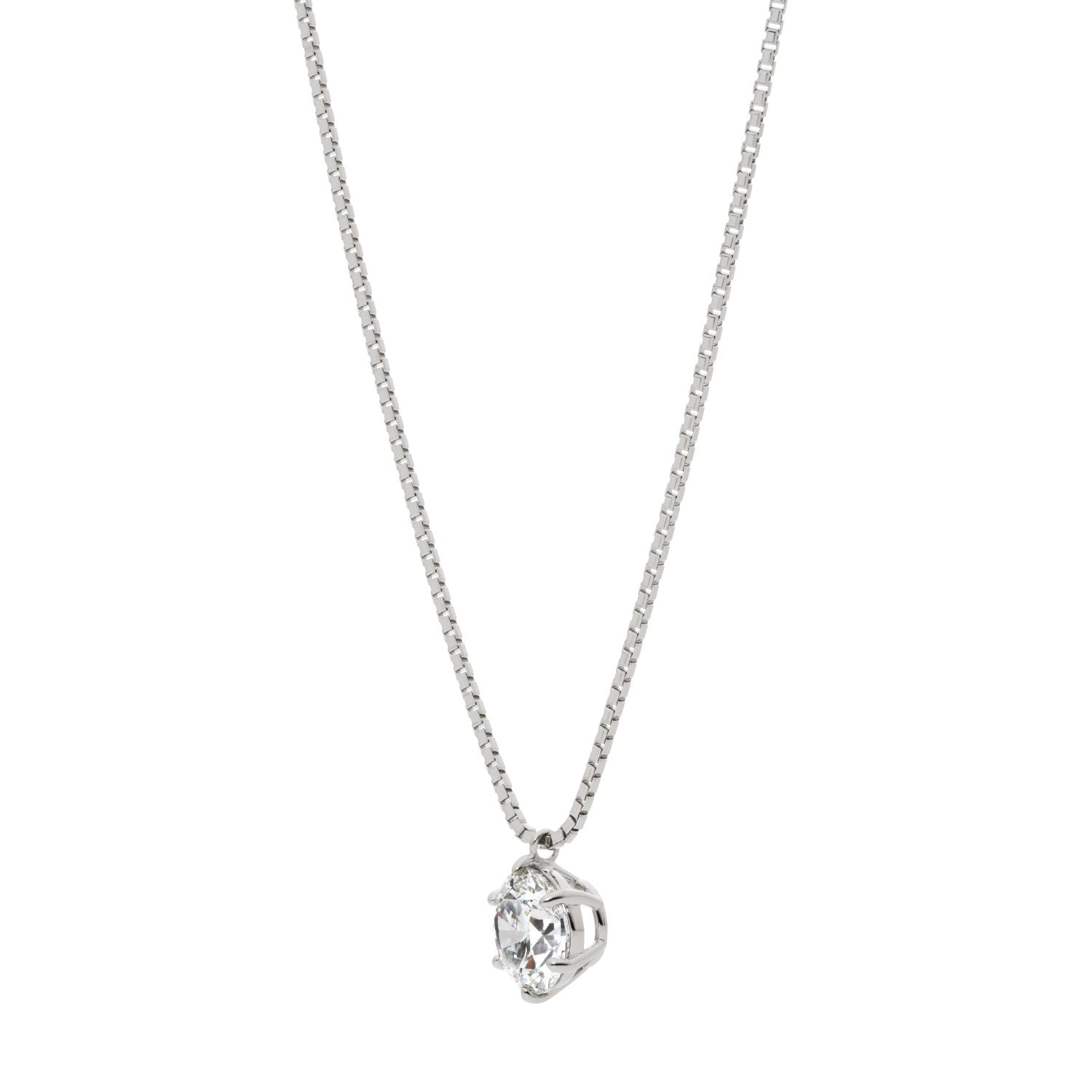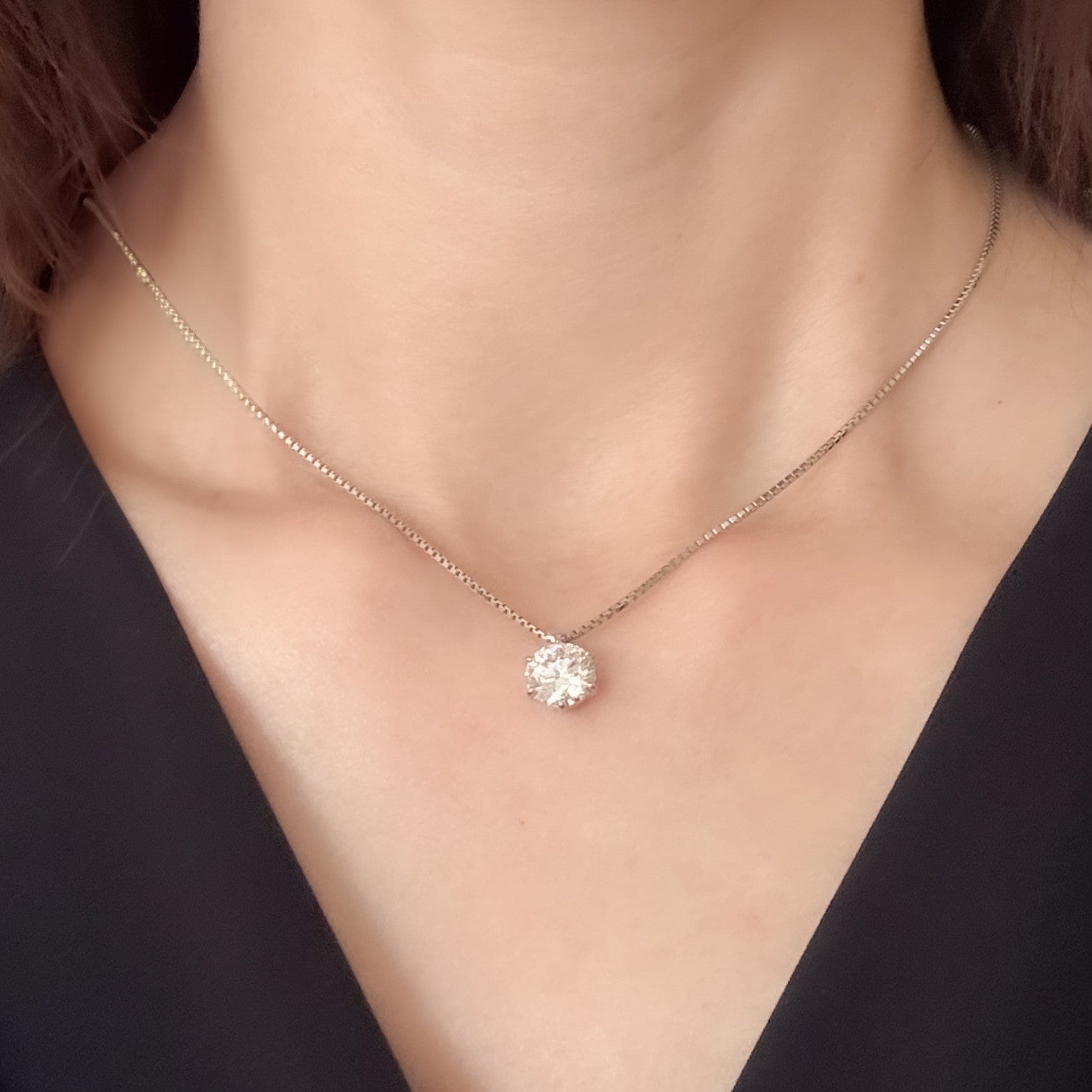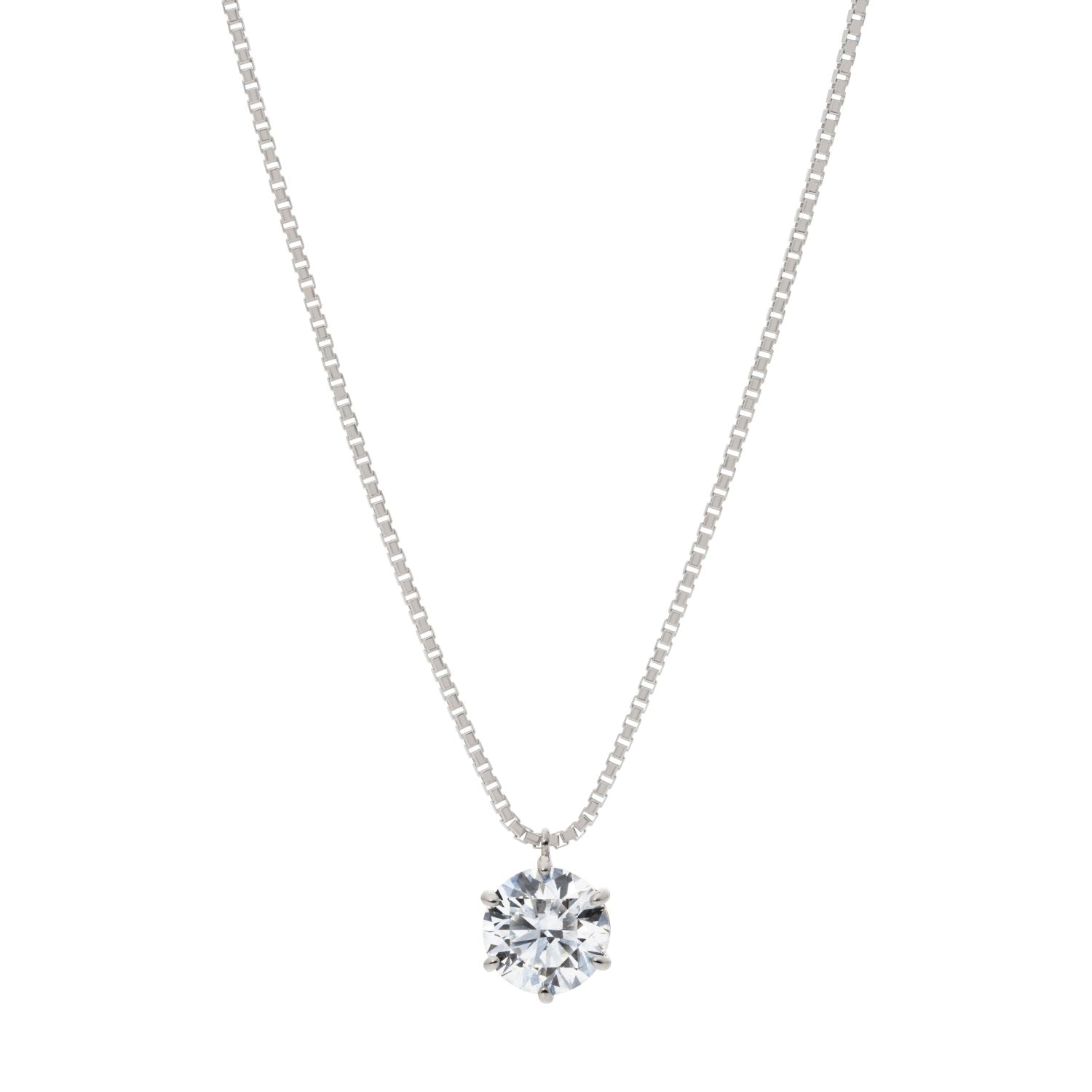 スルータイプのペンダントトップは6本爪で留める王道のデザインで、ラウンドブリリアントカットのダイヤモンドの輝きを一層際立たせます。